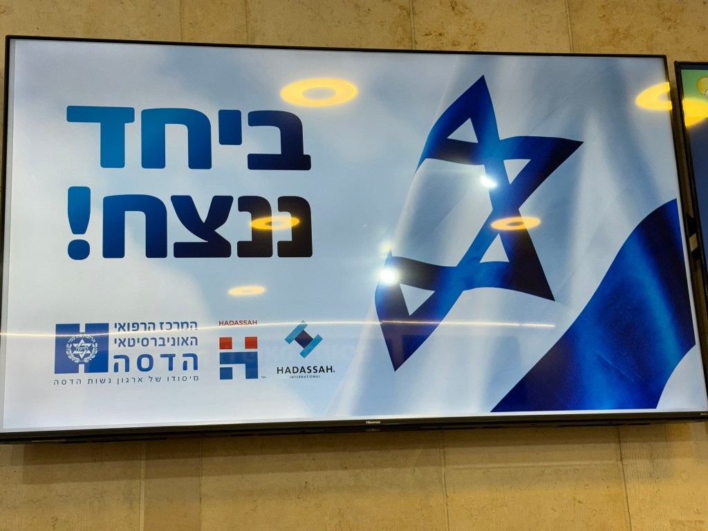 Everywhere we looked, from Hadassah hospital to the streets of Tel Aviv to the roads to the southern kibbutzim, we saw the slogan “b’yachad ninatzeach” often translated as “together we will win.” In reality, the slogan reads more like the verb, lehitgabeir, to overcome. Together we shall overcome. Our humanity and caring for eachother will get us through these difficult times. It is the crying call of every Israeli we meet.