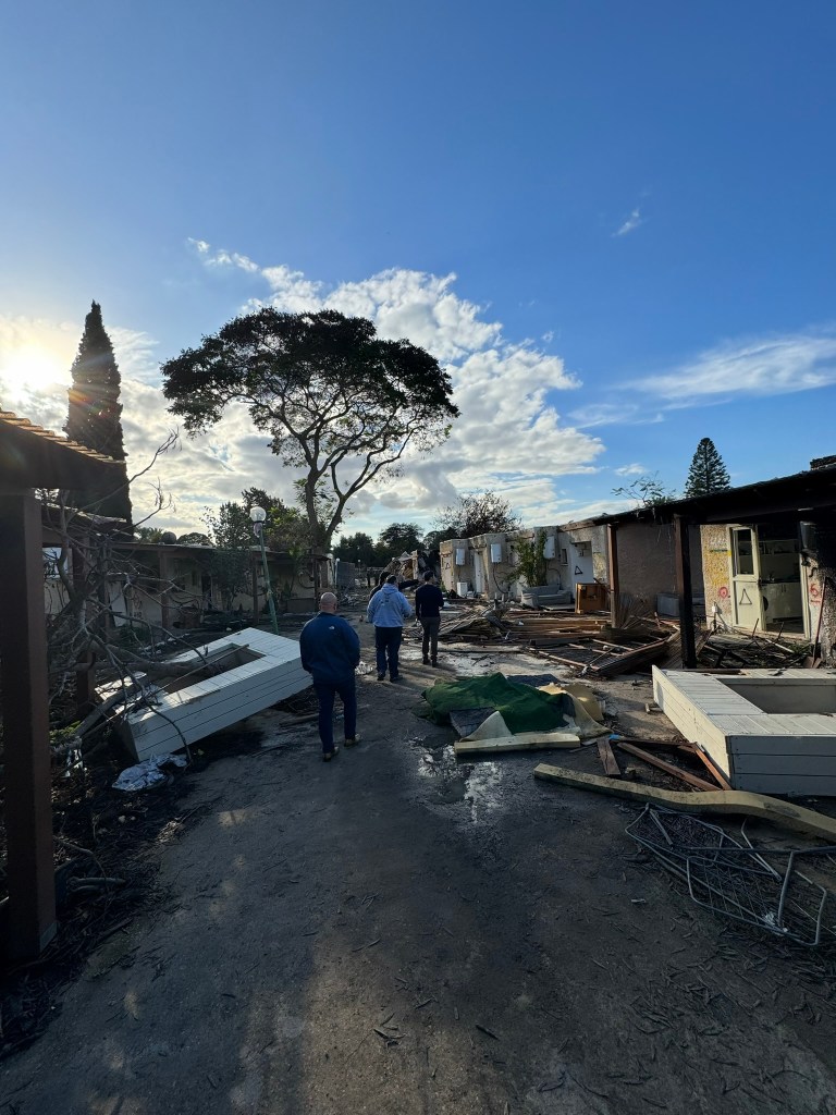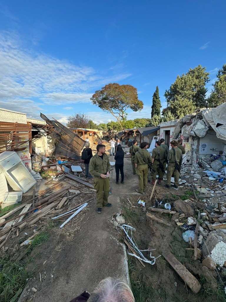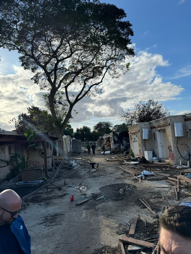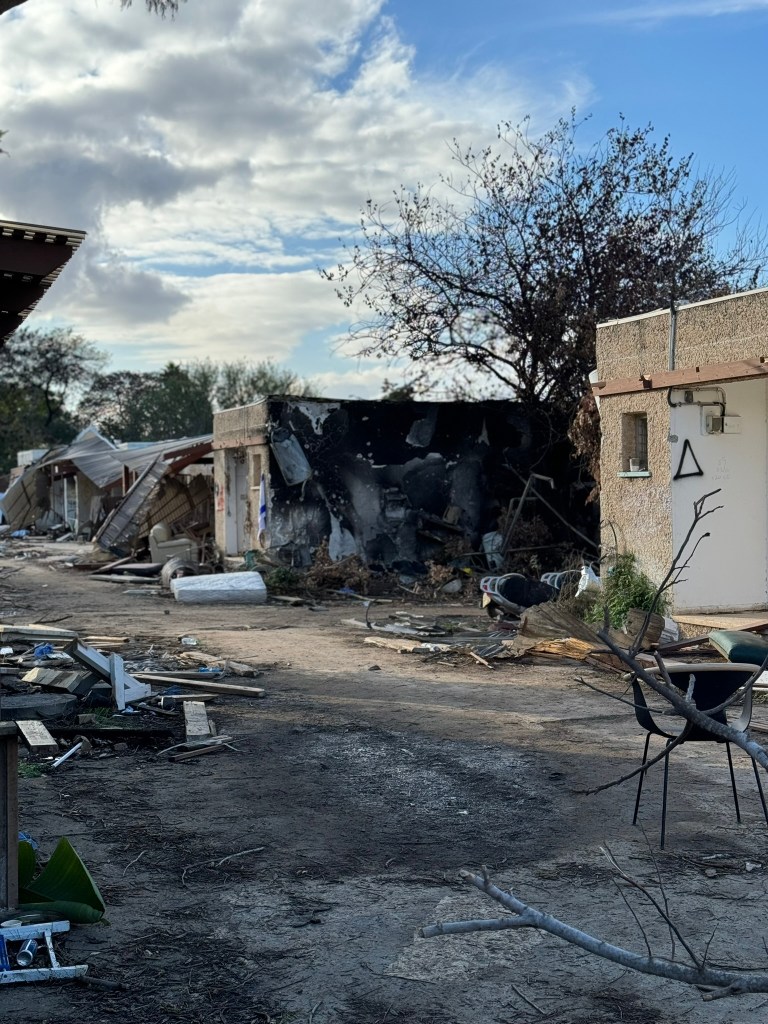 In many ways, visiting a place like Kfar Aza should come across as visiting a concentration camp- the smells, the sights of destruction, paired with the stories of atrocities and war crimes, are so overwhelming that I don’t know when I’ll fully process what I saw. And yet visiting Kfar Aza, led around the Kibbutz by a survivor who fought off 40 Hamas terrorists, is so far removed from any trip I ever made to Majdanek, Auschwitz, Dachau or any of the camps I’ve visited. For in truth, this is the balance of life here- Kfar Aza is the sight of a massacre, a shiva home to those who mourn, and ALSO a Wonderful place “ you should be jealous” our guide tells us that you would be living in a place like Kibbutz Kfar Aza, a privatized kibbutz home to over 900 members with a long waiting list to get in. This is a place that for now is frozen in time (sukkot are still up) and yet it is where the living want to return and will return, a place of loss AND a place, God willing, of life.