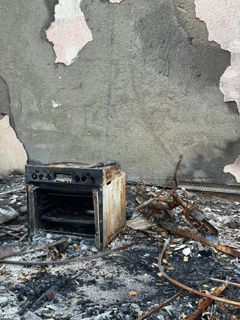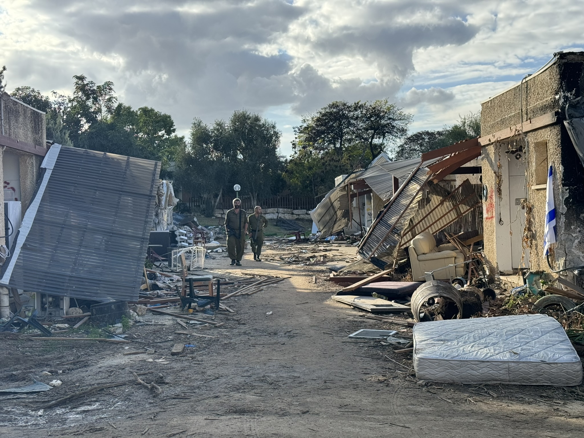 He explains that there were 3 waves of attack, led by Bakai (motorized gliders) that made their way over the Gaza border that morning and landed in five different places around the kibbutz. It’s clear that Hamas had a map (Google maps also has a clear outline of the kibbutz). The attackers knocked out the Kibbutz armory called the niishkiya- place where they held all the kibbutz’s weapons. This was just past 6:20 on the morning of October 7. By 7am, there were 100 terrorists in the kibbutz. Most of the destruction outlined in my photos is from the neighborhood known as Dor Hatzeir- a place where most of the young singles live- there are very few survivors of this neighborhood.